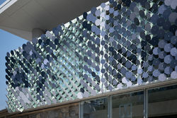The composition of these artworks took influence from local wildflowers and iconic flora of the Potomac River region. Virginia bluebells have a conical form, which is reflected in the South Pavilion’s circular parts. Whereas cherry blossoms have a star-like shape, which influenced the multi-pronged shape of the North Pavilion work. These distinct forms and colors create a clear identity for each of the pavilions while giving character to each area. The artworks are based on a halftone pattern methodology, which uses dots that vary in size and spacing to generate a gradient effect. With halftone images, the human eye interprets the patterned areas as if they were smooth tones. This artwork is designed to prompt similar moments of optical illusions for users who encounter the artwork each day from varying angles and perspectives.